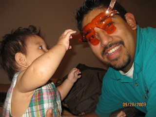 Santiago is quite the talker and I think he is going to have lots to say whenever he starts speaking real words all the time. He must get that from his talkative Daddy! Here's Daddy and Santi playing their glasses game with burnt orange longhorn glasses. Santiago loves to take glasses off and on your face.